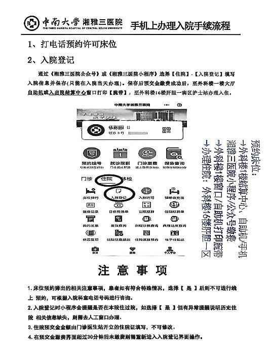 虽然中南大学湘雅三医院早就能在手机上完成入出院办理,但不少患者拿到住院通知单后,第一反应还是跑到病房找护士“约床”,再坐电梯到一楼办手续。